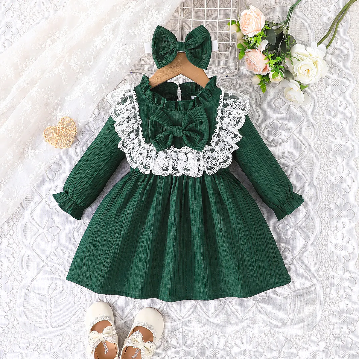 Children’s sweet and elegant exquisite lace ruffle collar long sleeved green dress skirts